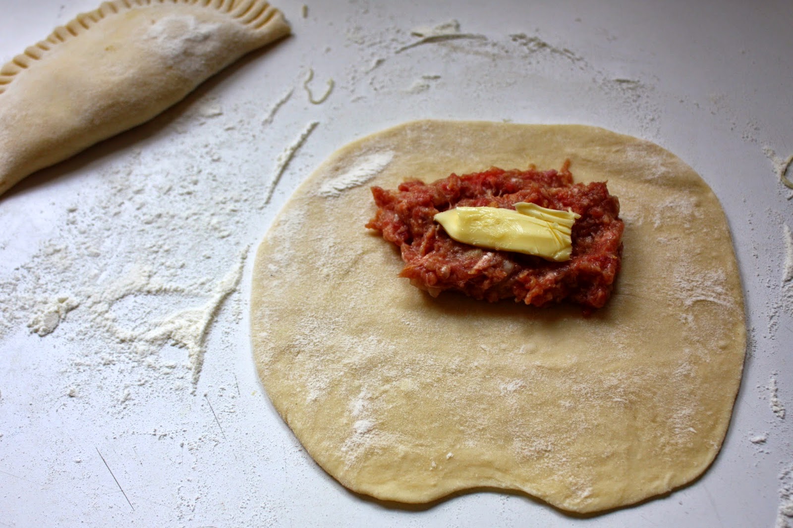 Каждый кусочек тонко раскатывать на притрушенном мукой столе. На одну часть теста выложить фарш. Сверху можно положить кусочек сливочного масла или тертый сыр.